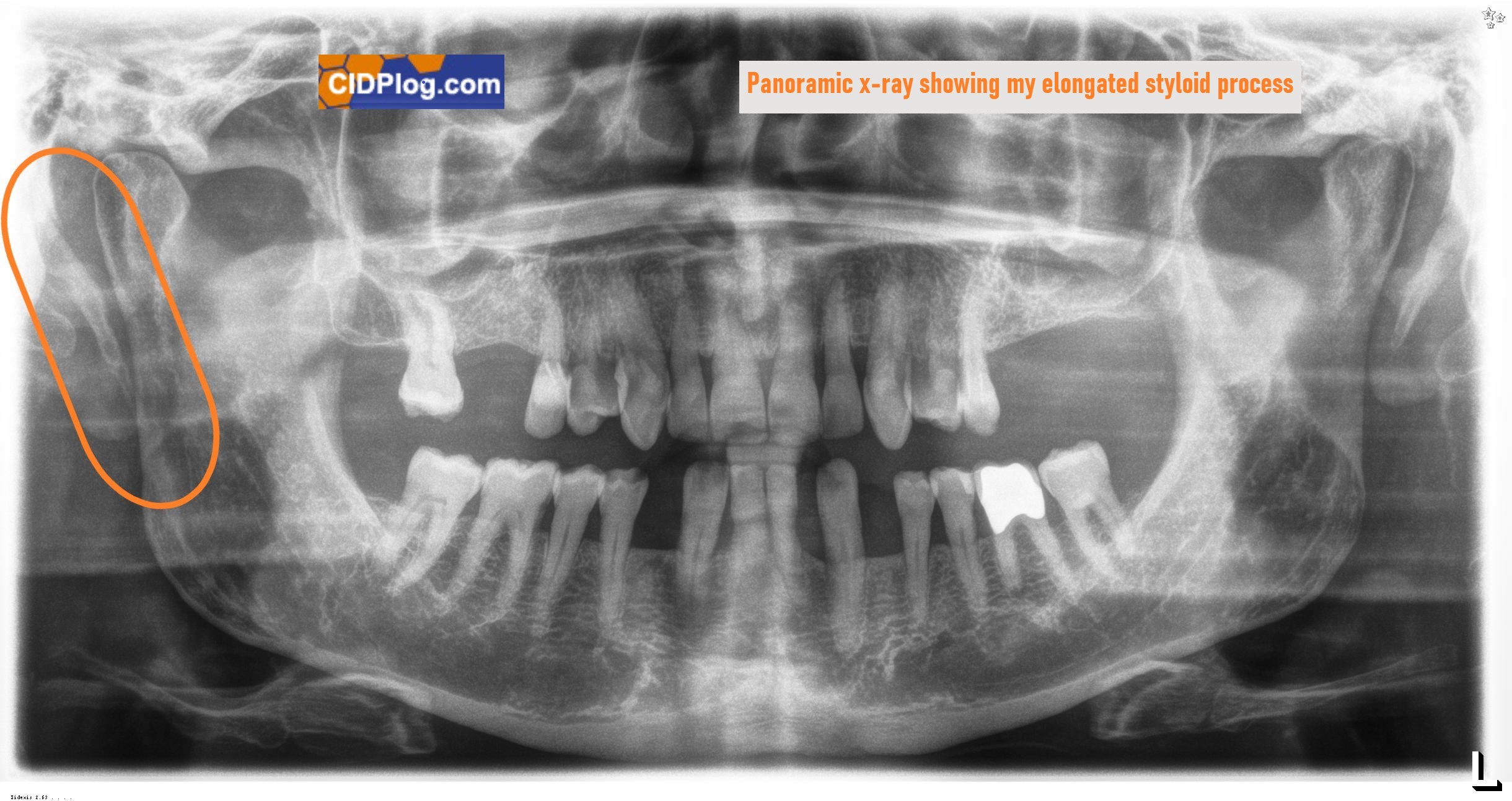 » July 16, 2024 Eagle Syndrome Diagnosis: a potential breakthrough on eye / facial pain as I have a diagnosis of "Eagle Syndrome", believe it or not after referral by my dentist!. I received the diagnosis less than a month after I consulted a (Canadian) ear, nose and throat surgeon who said I was in perfect condition! I had previously seen more than a handful of doctors and came up with a highly questionable diagnosis, a blank, or denial that anything was wrong. Eagle Syndrome caused by an elongated styloid process and/or calcified stylohyoid ligaments, could explain pretty much all my eye/ head/ face issues as it effects the vagus nerve and carotid arteries. Autonomic dysfunction is a feature of Eagle’s Syndrome, See panoramic x-ray showing my elongated styloid process. The vagus is the longest cranial nerve and comprises both sensory and motor fibers. he vagus nerve functions contribute to the autonomic nervous system, which consists of the parasympathetic and sympathetic. There are four forms of Eagle Syndrome: