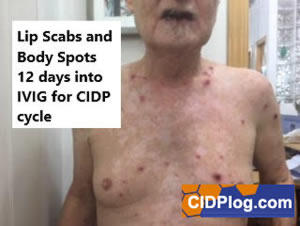infusion. On the 9th-day the blotches appear, turning into scabs through the 12th-day. Take a look at the actual photo on right - my CIDP lips with scabs - pretty ugly! After this time the lip-sore tissue mends and by the 16th-day I am clear. My lips though are now very "delicate" having had a few years suffering monthly peeling. In addition my lip-edges are bumpy / crevices / lined and getting worse. If anyone can offer a solution, I would love to hear from you.As of June 1, 2018 I began I three-month trial of very high "pulse-dose" dexamethasone corticosteroid aimed at suppressing the adverse effects of IVIG infusions in general. While the lip-scabs was the trigger: my doctor is also hopeful I will have less pain and also potentially cut back on the IVIG dose I take every four weeks for my CIDP. December 2018 I switched to sub-q CUVITRU IgG. This has pretty much solved my lip scab issue. (I did have one attack that lasted a month but since then only slight lacerations occasionally).