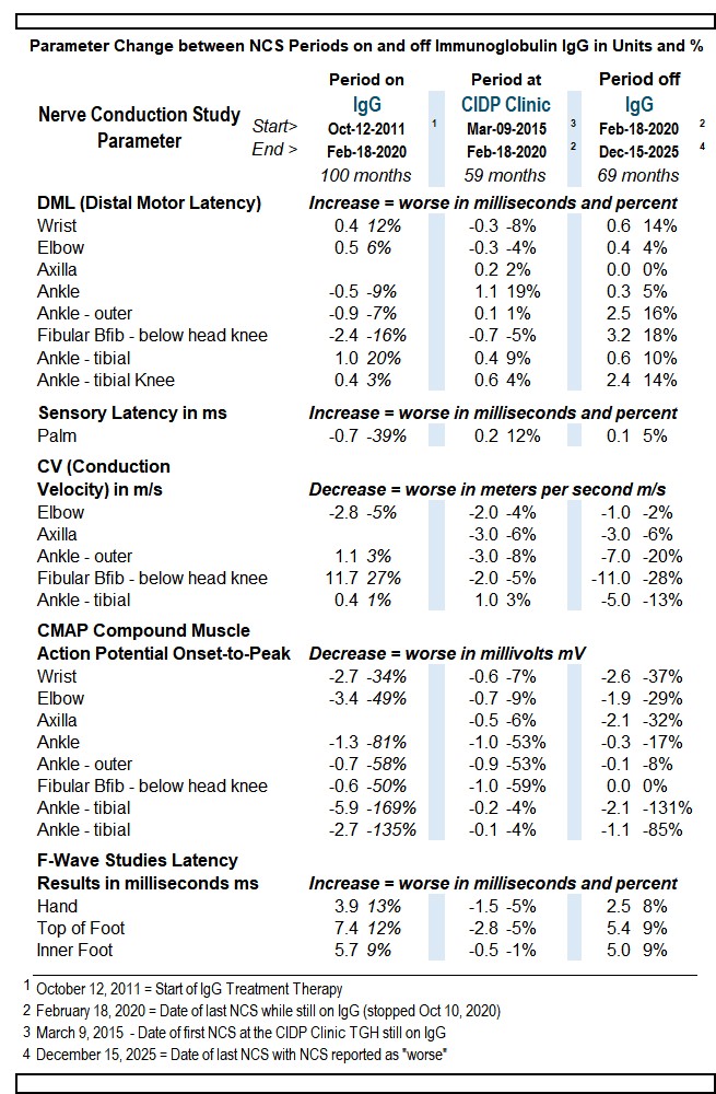 This is also largely supported in a more detailed breakdown of periods (except for the CMAP parameter). The following table shows the changes in units and percentage for the whole period, the time I attended the TGH CIDP Clinic, and for the 69 months I have received no treatment at all: