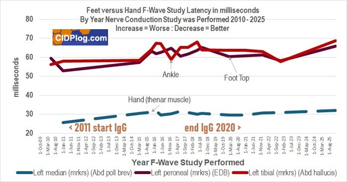 F-Latency (F-wave) prolongation: My results for F-Latency (F-wave study) prolongation in ms between 2008 and 2025: