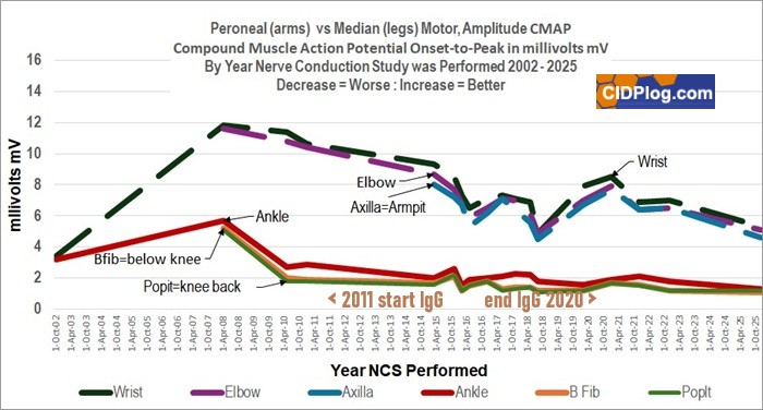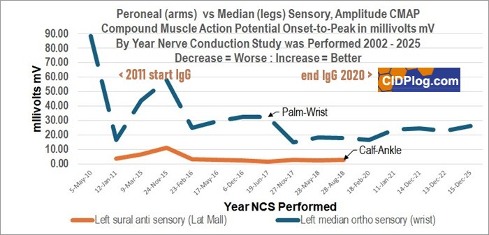 » April 2026: I have found unconscionable differences between what I have concluded now April 2026 versus what I have been led to believe in the past three years. Seems I was in deterioration-free-fall December 13, 2022 when the hospital CIDP Clinic report for the NCS of that day read:"nerve conduction studies are stable to better" and the clinical note for NCS read "Improved". Looking at the above data, I cannot find much, if any, evidence to support the CIDP Clinic statements. Indeed, the opposite is true and, rather, the deterioration accelerated that year between NCS done December 14, 2021 and December 13, 2022. Furthermore, the data does offer support to my reporting rapid spread of negative CIDP symptoms upwards from legs to arms. I am very worried about apparent axonal loss measured by CMAP - with its highly noticeable decline - which impair my mobility and could affect my central nervous system.