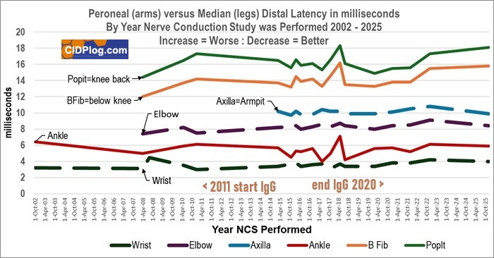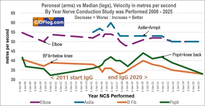 I was on IVIG or SCIG IgG for nine-years and pretty much always felt better when on than off. You can view my logs of how it was for on various pages of this website, and the period is surmise at the following link My Summary Assessment of Immunoglobulin IgG IVIG for CIDP 2011 until 2020. One can surmiser from the above NCS parameter trend charts that the infusions did mostly stabilize my CIDP while under treatment.