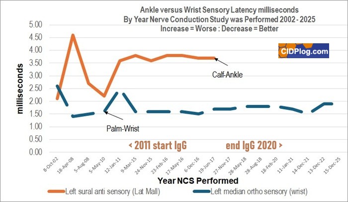 Sensory Latency: My CIDP doctors tell me that I am 70-80% sensory versus motor nerve involvement with my MADSUM classified CIDP. So below are my results for Sensory Latency between 2002 and 2025: