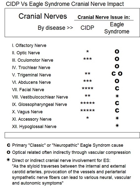 » July 27, 2025: With my now significant study of Eagle Syndrome, I have become increasingly worried that many of the symptoms I have long thought of (and been told by some neurologists) are likely caused by CIDP, actually are triggered by my Eagle Syndrome. My CIDP doctors should have at least known about Eagle Syndrome as it seems I had cranial nerve issues from the outset (2011). Now I am trying to find a cranial nerve specialist who can tell me the extent to which the cranial nerves are demyelinated (by CIDP) and which are damaged or compressed by the styloid process (which would be Eagle Syndrome)